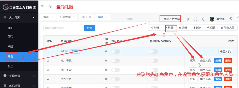 1、请您继续在左侧的人力行政中点开角色,进行增加角色,什么是角色呢?您可以理解为给员工账号什么样的角色,员工就可以有这个角色内相应的权限,就可以看到哪些功能或操作哪些功能。角色也是设置员工账号权限的位置(权限后续我们会陆续讲到);