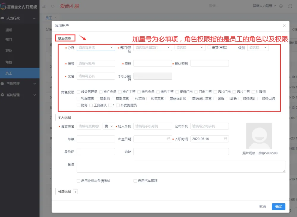 在添加员工账号时,一共有三个方面的信息,分别是基本信息、个人信息与可选信息