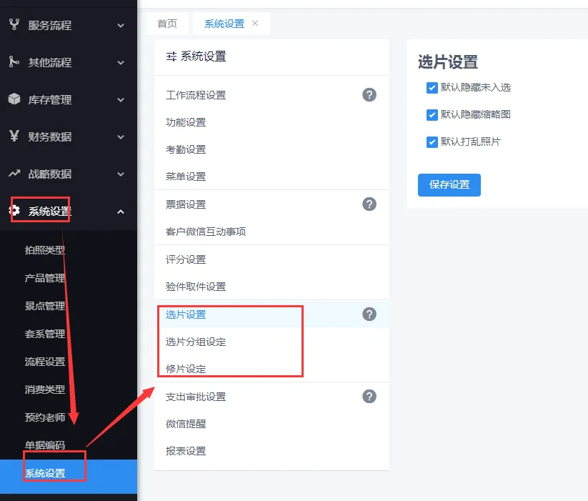 选片中涉及选片分组和修片设定的,需要在后台端的设置中设置后,再选片端刷新即可。