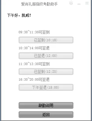 答:当设置好考勤的相关设置之后,在安装指纹的电脑上即可打开指纹考勤程序,按压指纹即可进行签到或签退;如果有通知未阅读或者绑定了工作未完成的则会限制打卡哦,务必实现当天事当天毕哈。