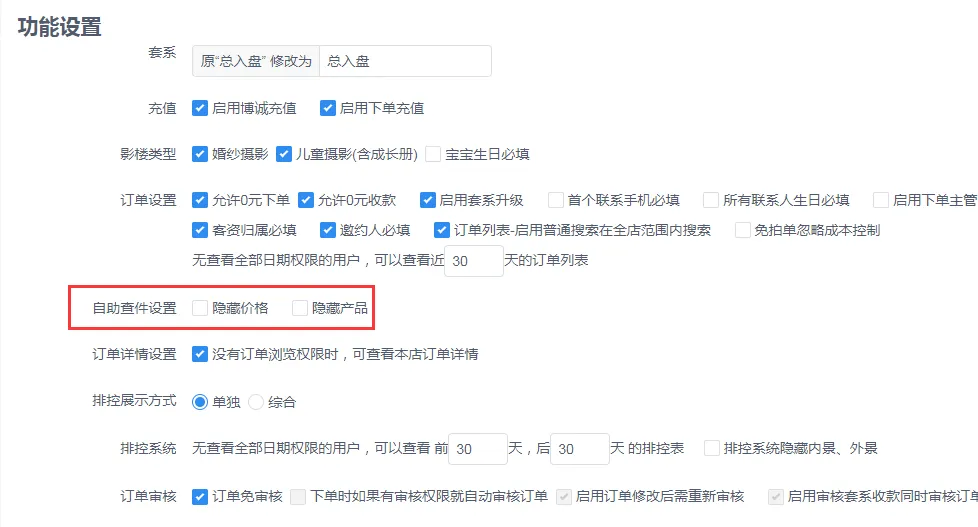 在设置中,增加自助查件是否显示产品、价格;可以自定义决定在客户自助查询订单时,是否显示价格或者产品。