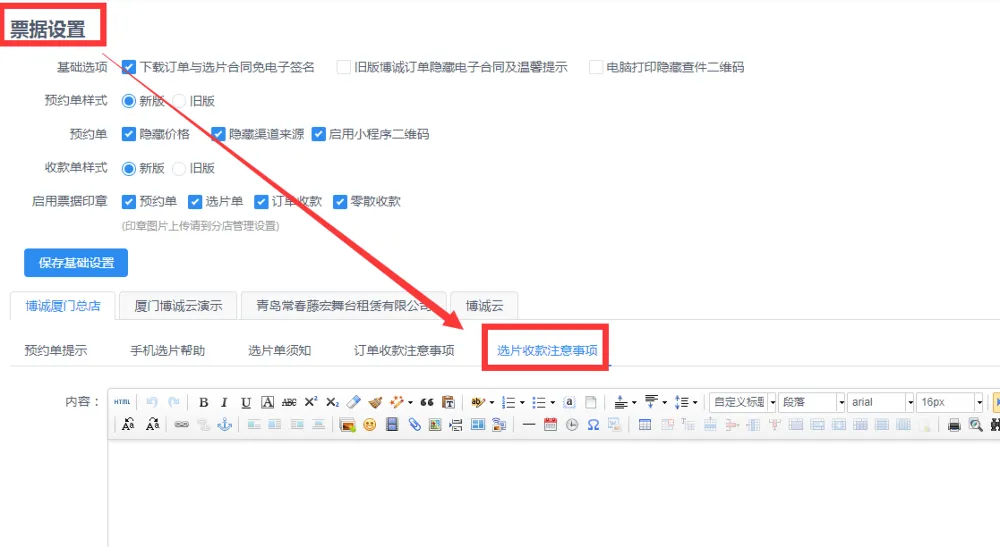 软件票据有在原来的设置上多增加了选片单收款的事项设置,方便针对不同类型的收款和单据可以设置不同的备注信息。