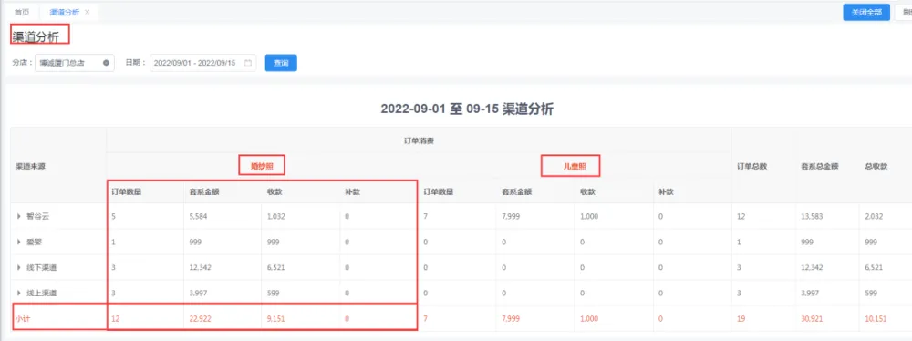 以上图为例,我们可以按照时间段和各自分店来查询,里面会显示渠道大类,比如线上渠道合计的订单数量、套系金额、收款以及其他月份订单在本月的补款。也可以点开大类显示里面的小类,比如线上渠道中,抖音、美团等渠道各自的订单情况。