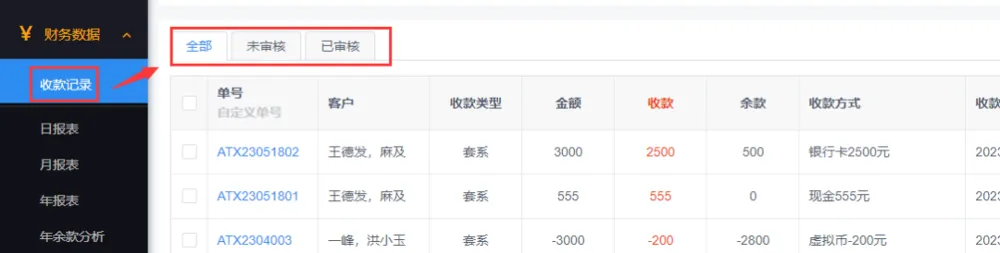 操作:手您可以在左侧的【财务数据】中的【收款记录】中使用相关功能。