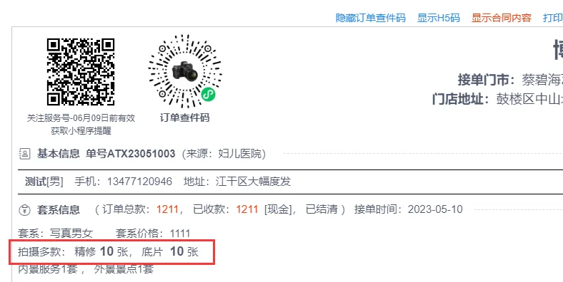 作用:该如何客户在订单的时候或者订单识别中,如果精修和底片的张数为0时,预约单将隐藏上图中的拍摄多款;如果数量有变动的您可以在产品调整中修改。