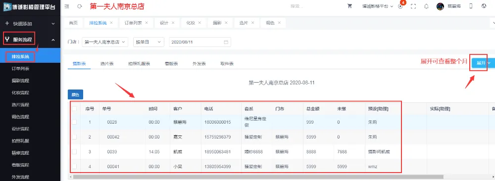 操作方式为:点击客户单号进入【订单面板】-【工作安排】-选择【摄影】流程,如拍一半的,再【新增】摄影时间按照正常的预设人员操作即可。建议有调度或专人负责,避免档期混乱。