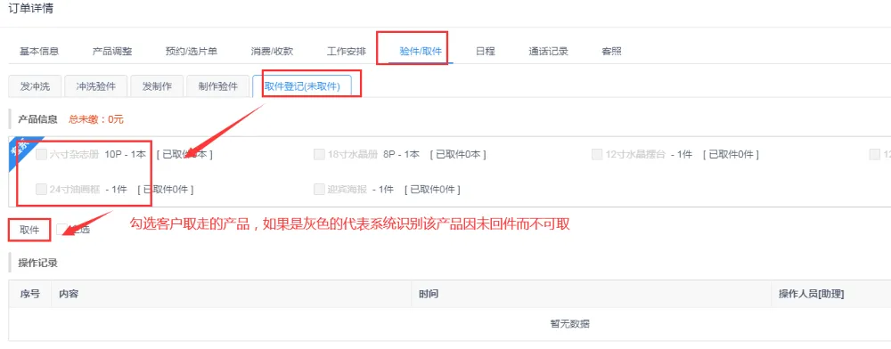 答:客户取件后,需要及时再软件上登记取件操作,操作方式:点击客户单号进入订单详情-【验件/取件】-【取件登记】勾选客户已经取走的产品提交保存即可。需要注意的是,取件登记前需要确保【冲洗】、【送制作】、【制作回件/验件】等环节已经完成。另外如果有欠款则无法取件登记需要及时缴清尾款方可。