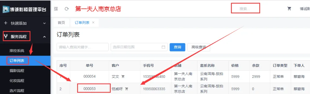 答:查询客户时,可以在软件右上角的【搜索栏】中通过客户的姓名、电话和订单号来查询,也可以通过左侧的【服务流程】中的【订单列表】来查询;建议通过电话或单号查询的话是比较准确的,因为单号和手机号具有唯一性,通过姓名可能存在同名同姓需要再次确认客户信息以防操作错客户。