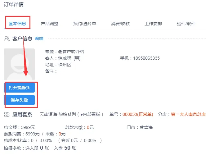下单时没有直接拍需要后续上传的方法:得到客户照片(小于1M)-查找客户订单-点【基本信息】-【修改头像】-本地上传(或在拍照上传)即可