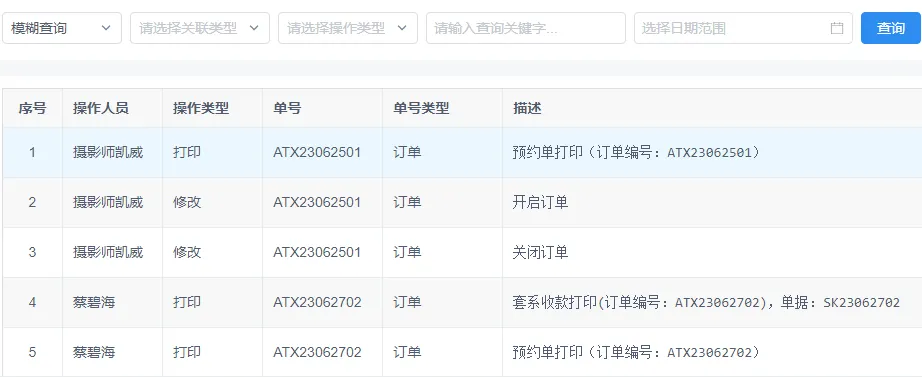 操作:您可以在订单里面的【日志】或其他流程中的【操作记录】中查询。
