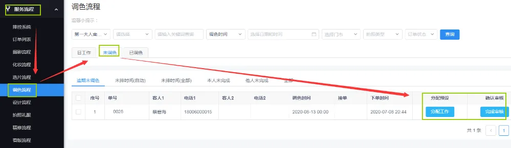 分单(即分配工作)的操作方式:您可以在左侧的【服务流程】中查看具体的如【设计】、【调色】等流程中的未设计/未精修来根据客户情况进行【分配工作】好人员以及预计完成时间并保存;