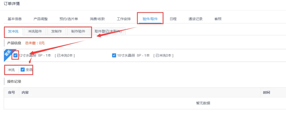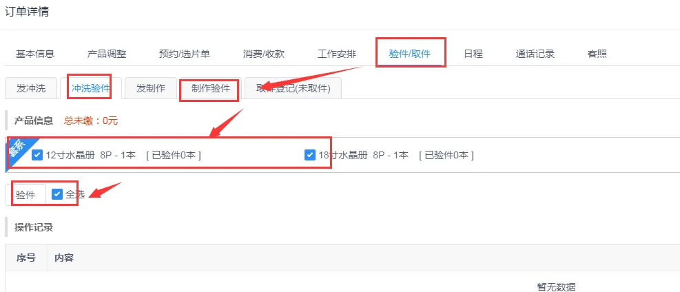 答:送制作时,您可以点需要操作的客户单号或信息进入到【验件/取件】中的冲洗或制作环节,勾选要发给供应商的产品提交,选择好供应商与预计回件时间保存即可。