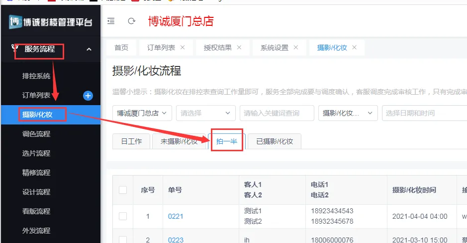 修改后系统默认就是拍一半,这个时候可以在左侧的【服务流程】摄影流程中查看拍一半的客户有哪些,后续可以正常的继续邀约时间安排。