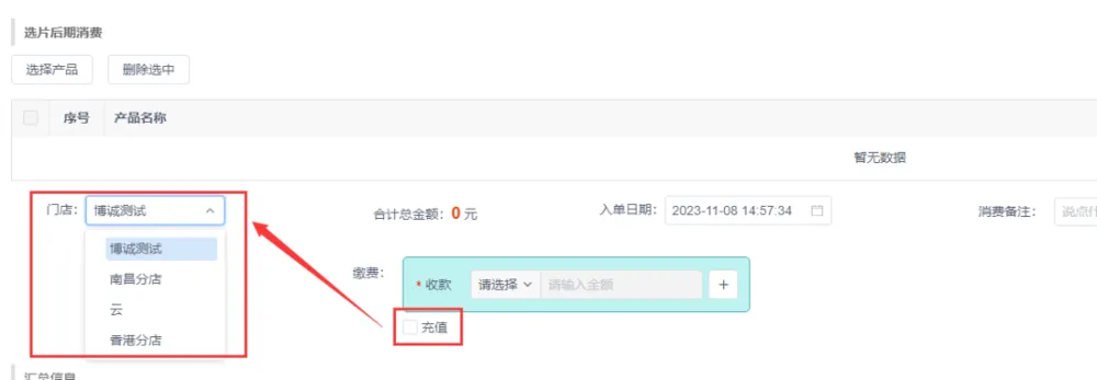 操作:如上图所示,当您确认选片并添加后期消费时,门店是哪个店充值就算哪个店。