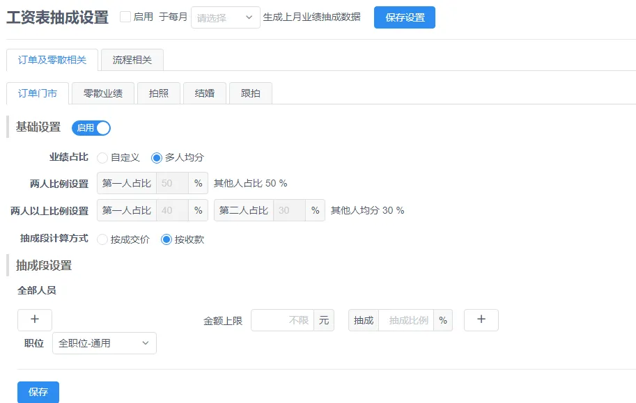 作用:原有工资表基础上,可以设置不同的抽成方式,并自动统计提成信息。