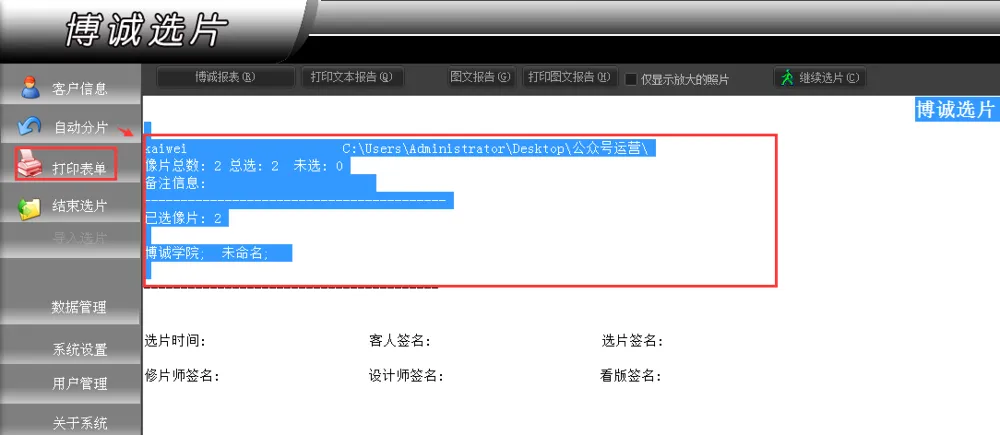 特别说明:当您使用选片快手7时,无法自动提交报表,需要您手动点击左侧的【打印表单】将选片详细信息手动报表到网页系统中确认;