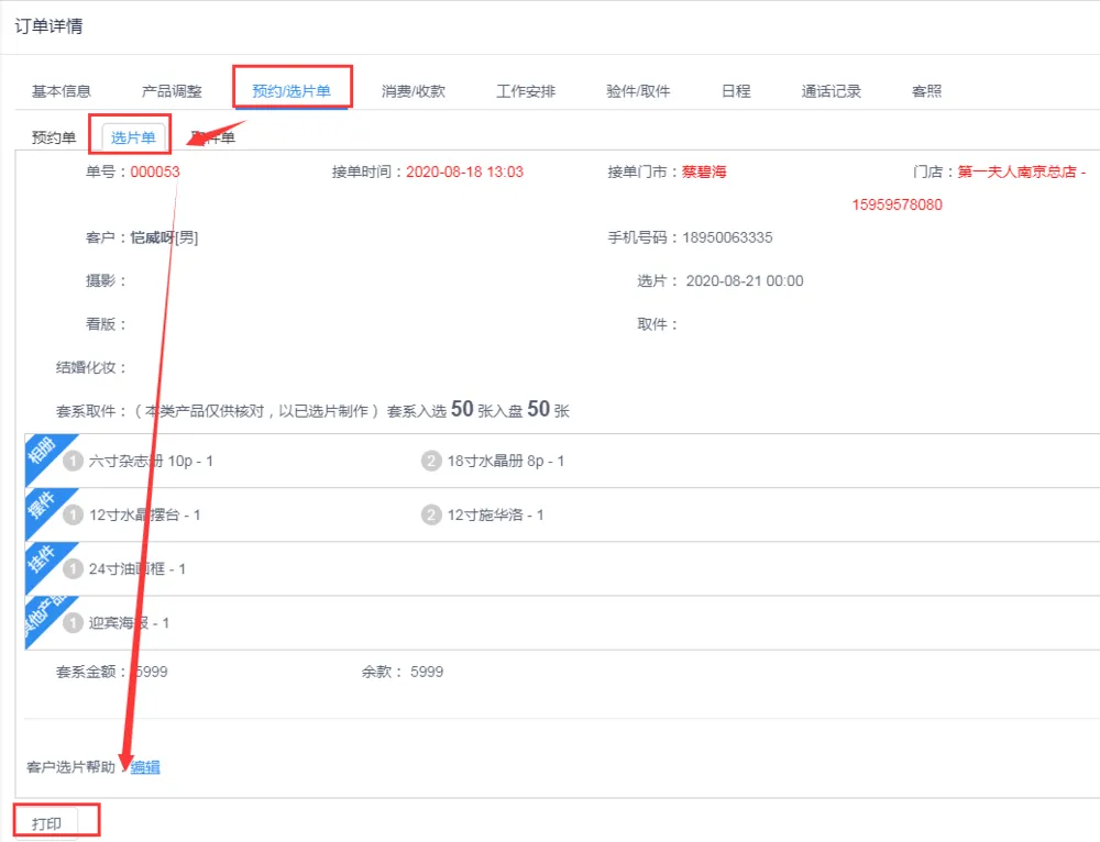 第三步:随后可以在预约/选片单中打印选片单给客户确认签字;如下图