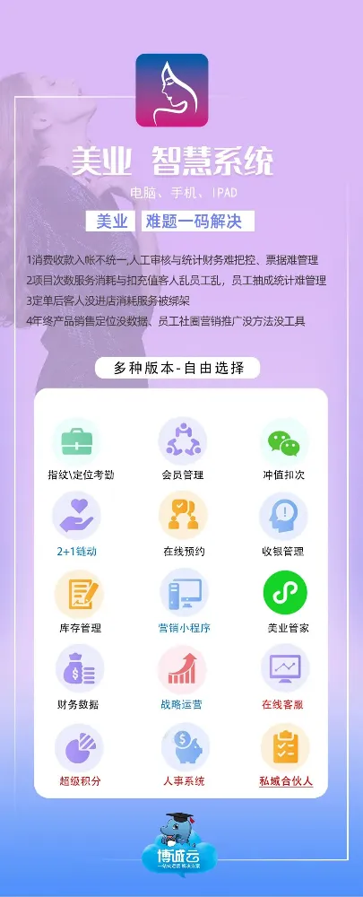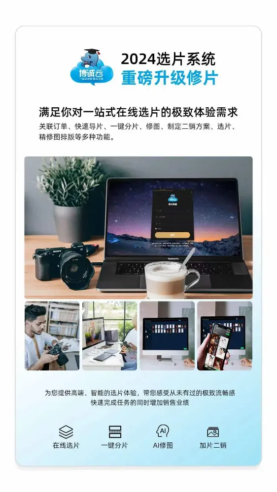 博诚云为行业用户提供一站式运营解决方案。目前博诚云提供人像行业相关的软件和思维工具,在此基础上不断为用户提供更多可选择的拓展延伸方案,为用户提供更多的业务发展方向,致力于企业可持续增长。