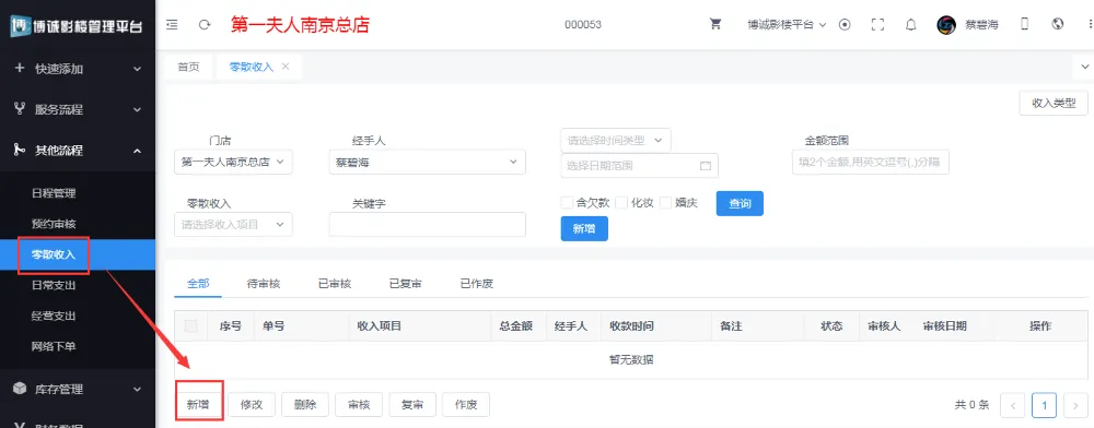 我们需要在左侧的【其他流程】中点击【零散收入】进行新增即可;(如果没有您需要的零散收费项目,可在右上角的【收入类型】中新增)