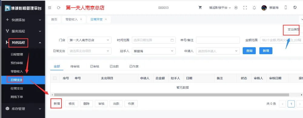 第三、如何登记日常支出与经营支出(操作方式一样,只是选择的项目不同,如果新增时没有找到要添加的项目可以现在页面的右上角【支出类型】中新增即可)