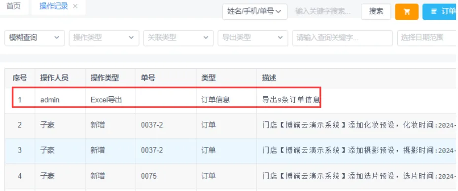 作用:在操作日志中,增加显示订单、流程、排控以及各报表导出记录在操作日志中。