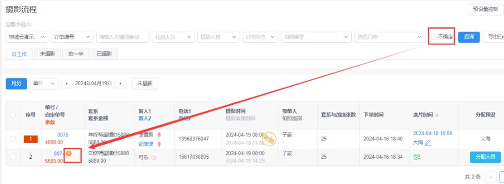 操作:您可以在【服务】-具体的某个流程中查询不确定当天档期的客户。