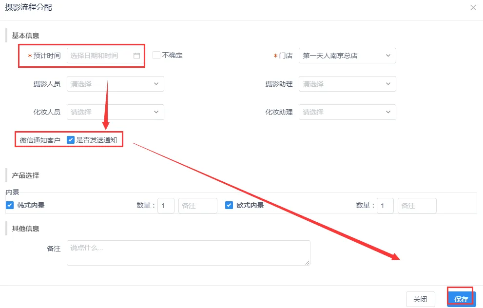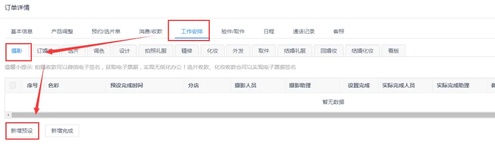 新增预设可以新增服务时间,暂时无法确定的可以仅安排时间,如果能够确定摄影师可以安排摄影师并选择发送提醒