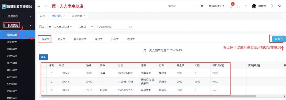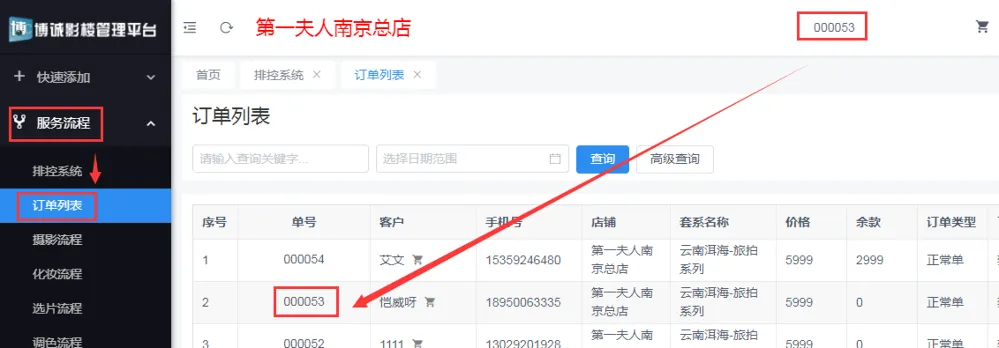 首先,我们需要在左侧的【服务流程】中的【订单列表】或者最上方的搜索按钮找出需要安排档期的客户。