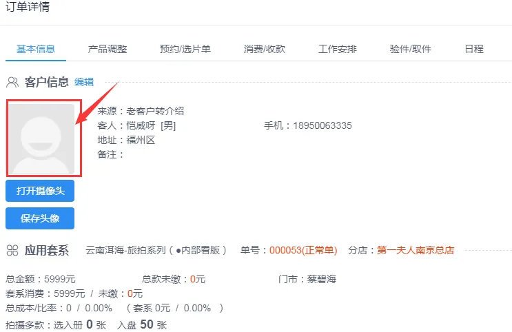很多企业在客户订单后都会上传客户的头像或者是现场拍照上传,这样的方式首先会让客户感觉很正式,也会对我们后续员工服务过程中知晓客户情况有所帮助,不过在这个过程中需要我们服务人员积极的引导,并要求我们摄化老师提前认识客户的样貌,做到贴心服务;那我们如何在系统中给客户上传头像呢?