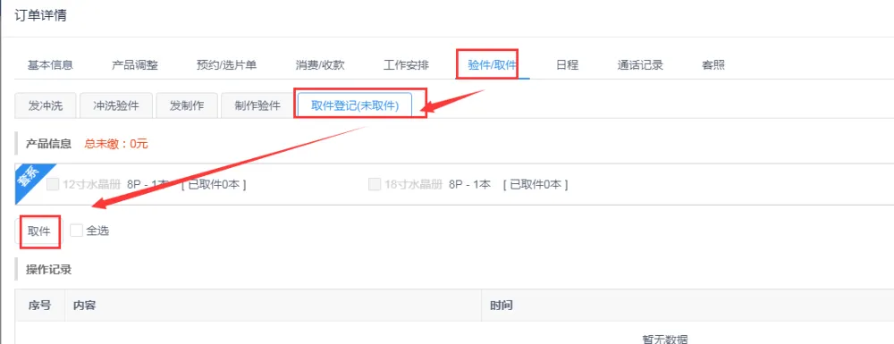 第二步、点击取件的客户订单号,进入订单详情的【验件取件】中进行【取件登记】(PS:前提需要完成制作环节哦)