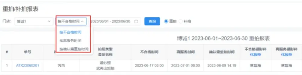 重拍补拍中主要有三个种类,分别是:按不合格时间,按再服务时间以及按确认需重拍的时间来定义。当您选择其中一个模式后,即可选择时间来查询。