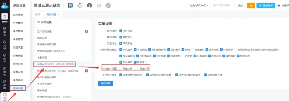 首您可以在左侧的【设置】中的【菜单设置】中找到自助查件设置里面,打钩隐藏价格即为隐藏,不打钩则为显示价格。对应的您还可以在其中隐藏套系内的产品,以及隐藏小程序中客户查询到的其他项目可以隐藏。