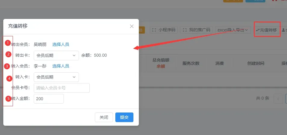在转出和转入人资料都有的情况下,左上角切换到【模块宝】在左侧的【服务】中的【会员管理】右上角上点击【充值转移】即可操作。如下图一