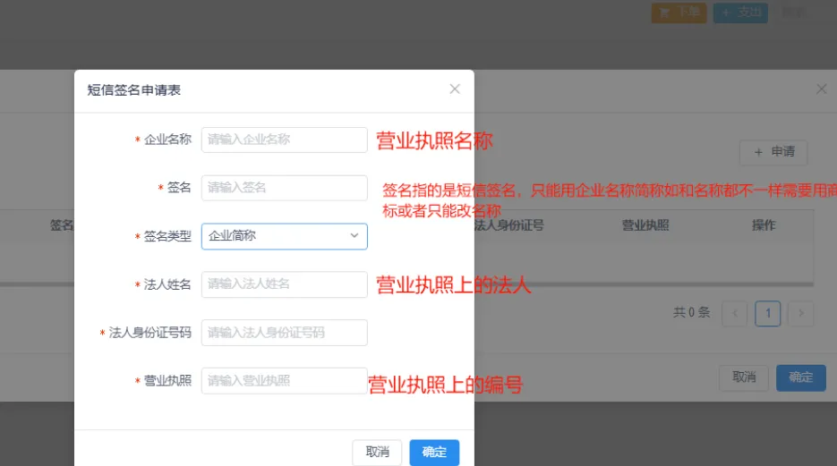 如上图所示:您提交的短信签名需要和您营业执照上的名称编号以及法人对应的身份证号码一致。签名需要使用企业简称,如果签名和企业名称差距太大会影响短信发送,如果名称不同可以推荐选择签名类型为商标并提交商标编号。如果都没有的情况下,建议签名使用企业营业执照的简称执行,然后店名在短信内容中体现哦。