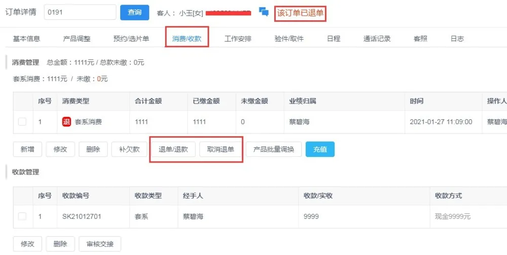 答:客户出现退单的时候可以在客户订单的消费收款中勾选要退单的项目执行退单,如果客户后续不退单的话,需要删除退单记录并取消退单。