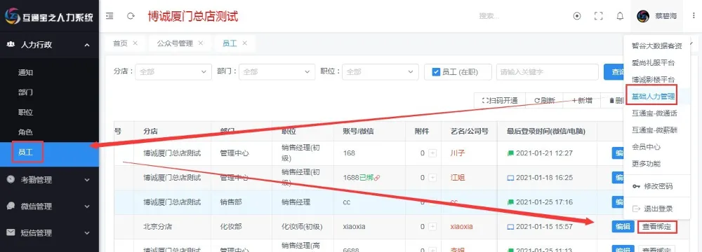 答:APP的安装我们之前有分享过,点击复习;当APP安装后会和手机绑定的,如果换手机的话需要先解绑在绑定;解绑方式请先切换到【基础人力管理】在【员工】中找到【查看绑定】的员工进行解绑。