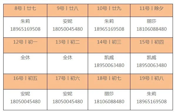 4、初一、初二为全休,期间如需协助的请按联系第三条信息为您安排;